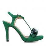 Sandalia de color verde, con tacón de altura medio-alta de 8.5cm. Tiene una tira que sujeta el empeine y va cogido al tobillo. Sandalia cómoda y elegante.